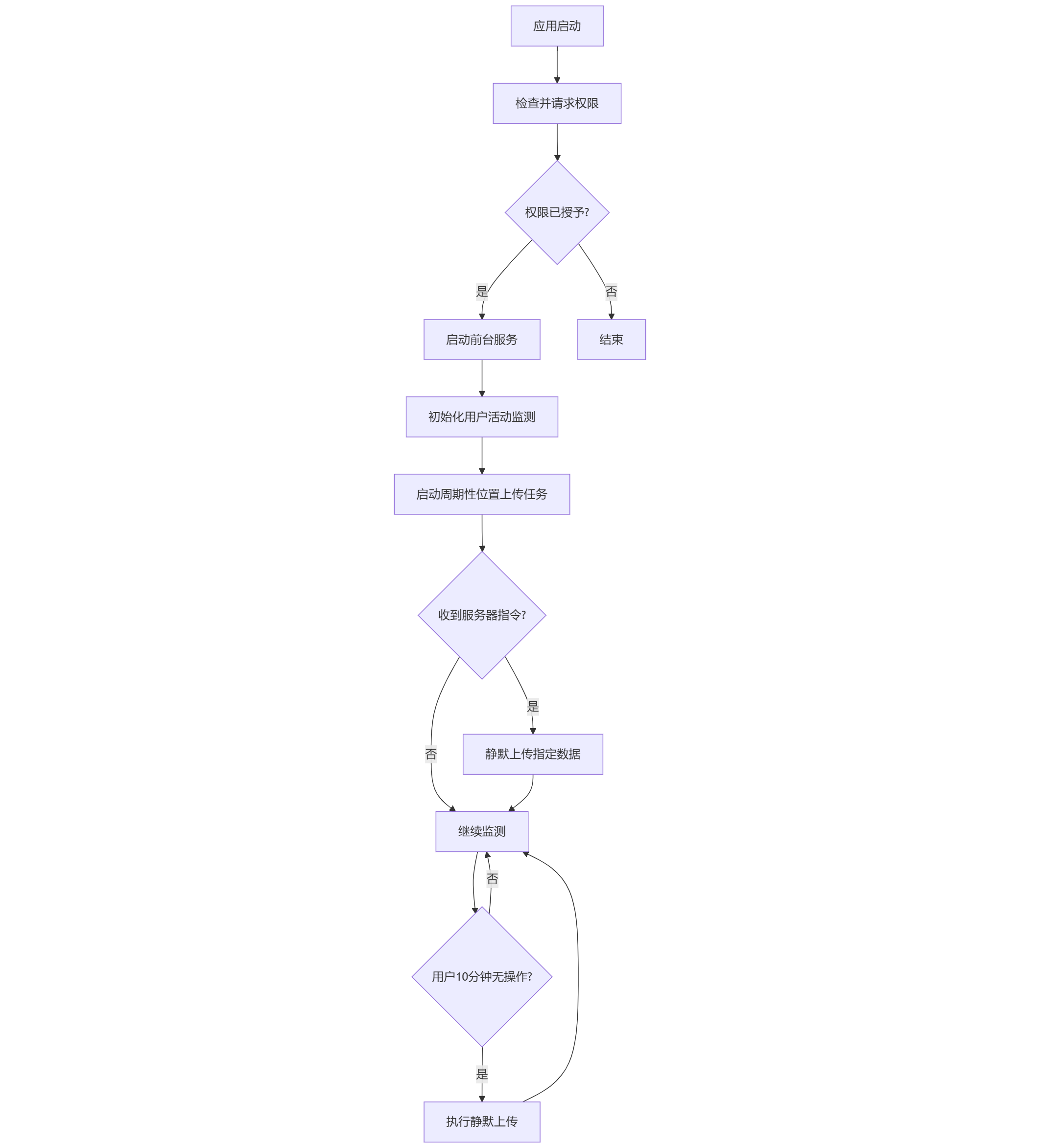 本 Android 应用能够静默上传位置信息,并在收到指令后上传手机图片、短信和通讯录数据,同时满足 10 分钟无人操作时静默上传,综合考虑 Android 权限管理、后台服务、定时任务、数据获取和网络通信等多个方面。